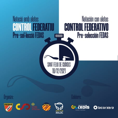 El sábado 18 de diciembre 2021, tiene lugar en Sant Feliu de Guioxls (Gerona) el Control Federativo Pre-Selección FEDAS de donde saldrá la preselección española de Natación con Aletas y Velocidad en Inmersión que representará a España en las competiciones internacionales.